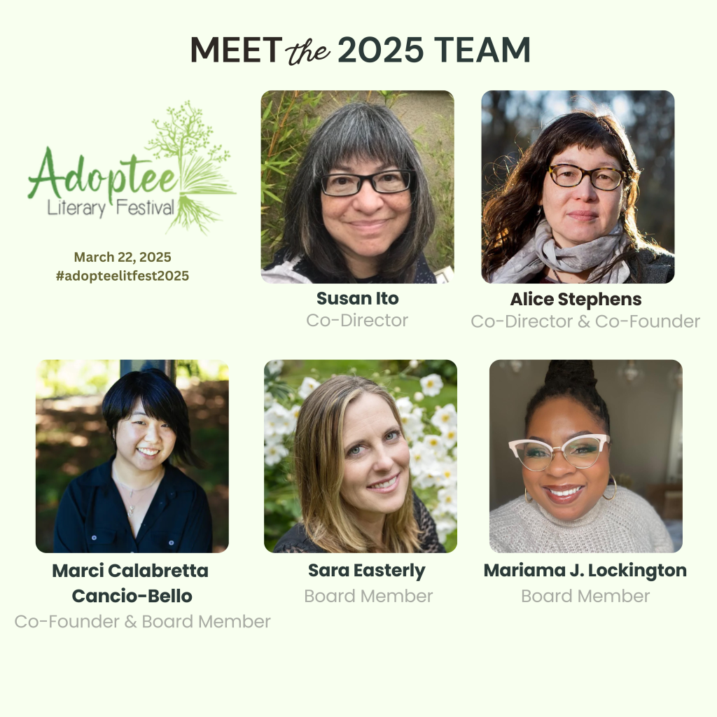 Our team is excitedly working to make the next Adoptee Literary Festival our best yet! We look forward to welcoming you all for a day full of learning, sharing, and community building. You can learn more about each member of our board and organizing team below.